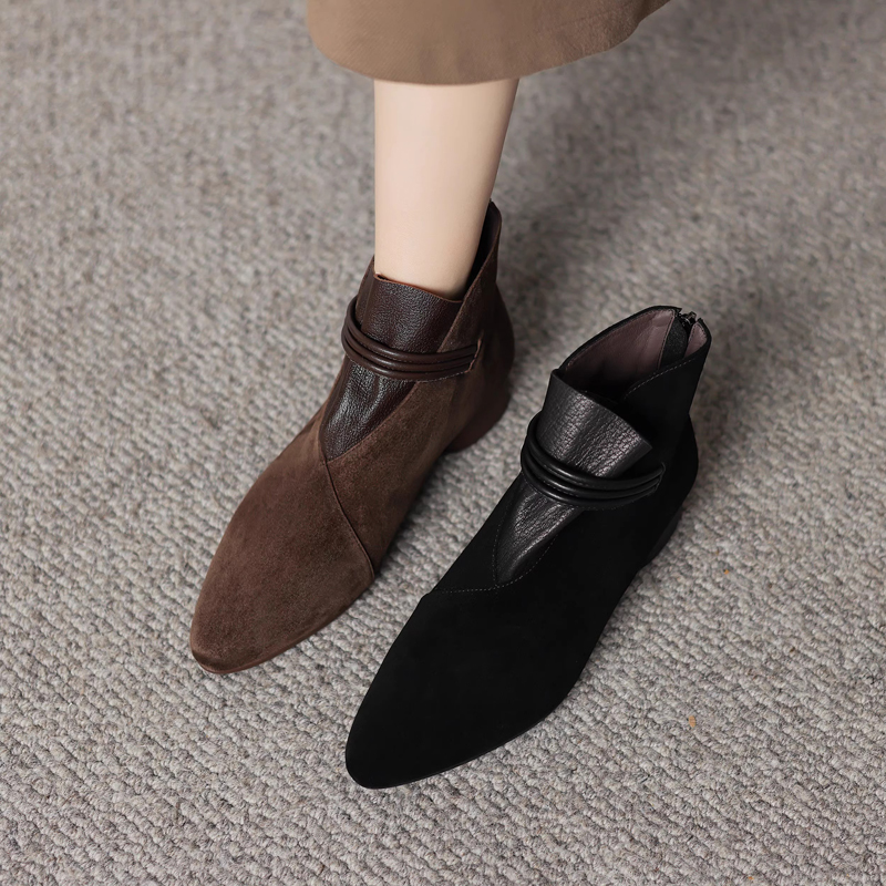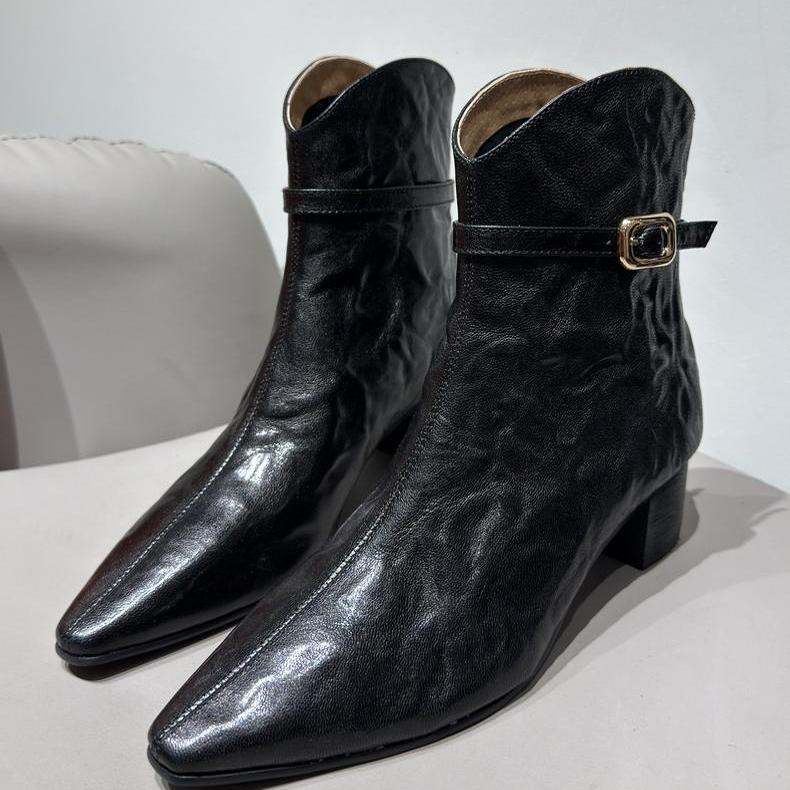 法式复古尖头中跟短靴女2024年秋冬新款软羊皮及踝靴百搭显瘦单靴