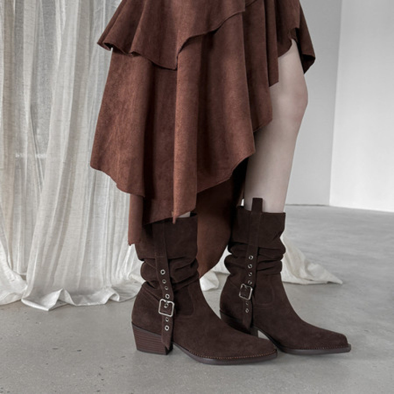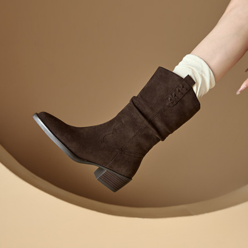 女士宽松有个性时尚2025年新款粗跟尖头中跟短靴子中筒复古西部靴
