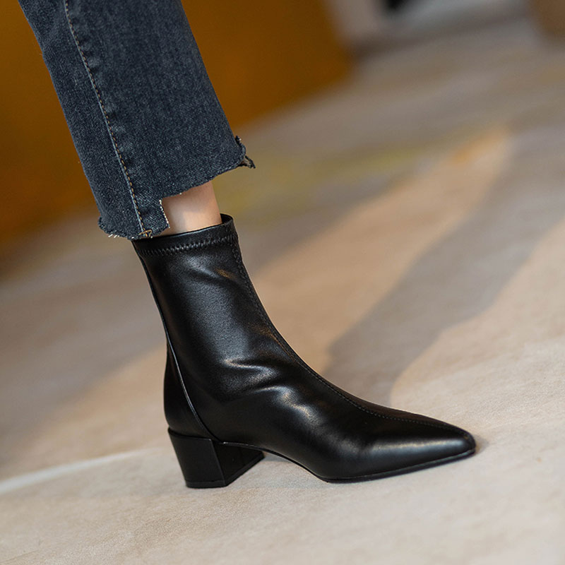 步享~黑色尖头中跟短靴女2025新款韩版粗跟真皮后拉链弹力瘦瘦靴