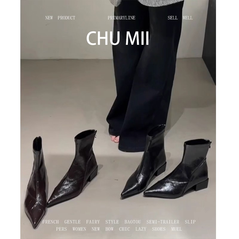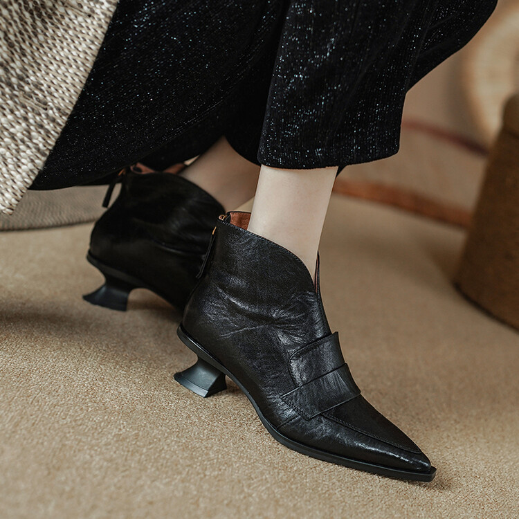 轻奢质感~复古法式真皮气质尖头中跟马丁靴女后拉链瘦瘦粗跟短靴