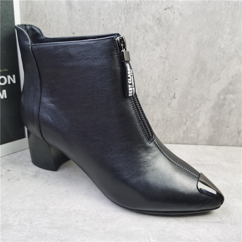 全牛皮尖头中跟短靴女真皮粗跟加绒女靴英伦风侧拉链踝靴时装靴子