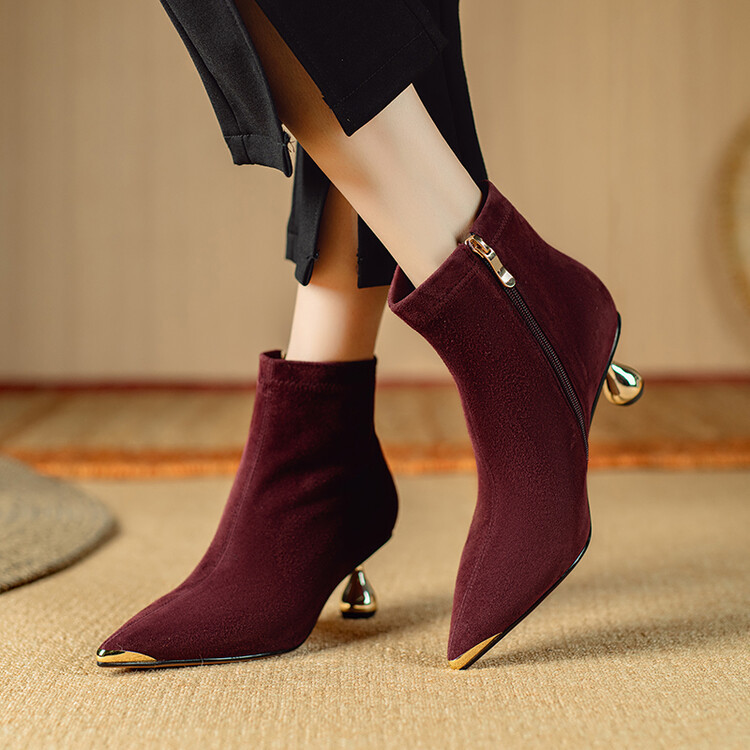 法式尖头中跟短靴女法式酒红色气质金属头加绒细跟单靴踝靴瘦瘦靴