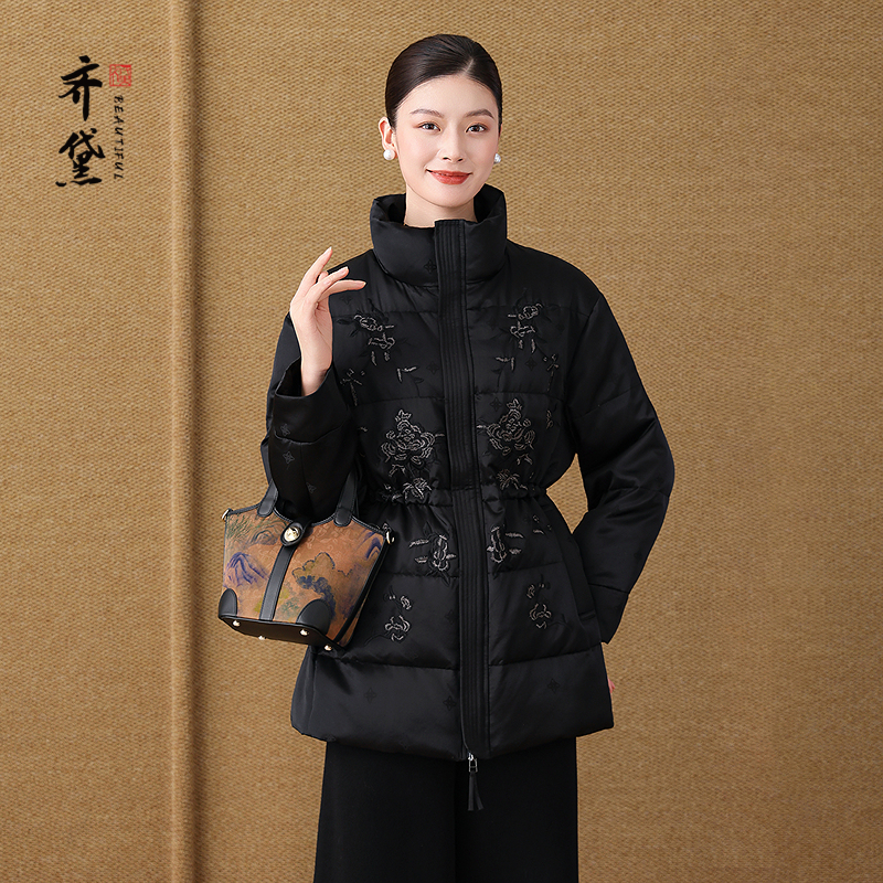 商场同款鹅绒服女2025新款新中式妈妈冬装刺绣真丝羊毛羽绒服外套
