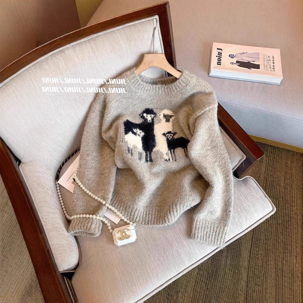 专柜撤回剪标复古小羊刺绣毛衣女秋冬新款慵懒软糯洋气套头针织衫