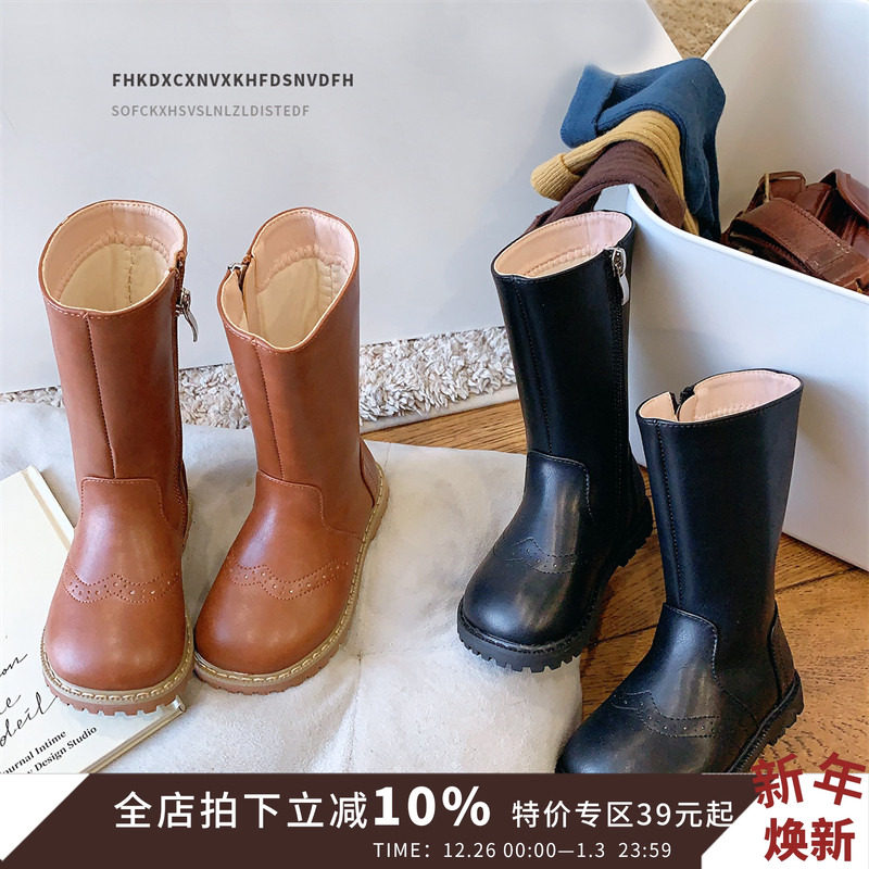 韩版女童高筒靴秋冬季复古儿童马丁靴雕花舒适中小孩童鞋男童单靴