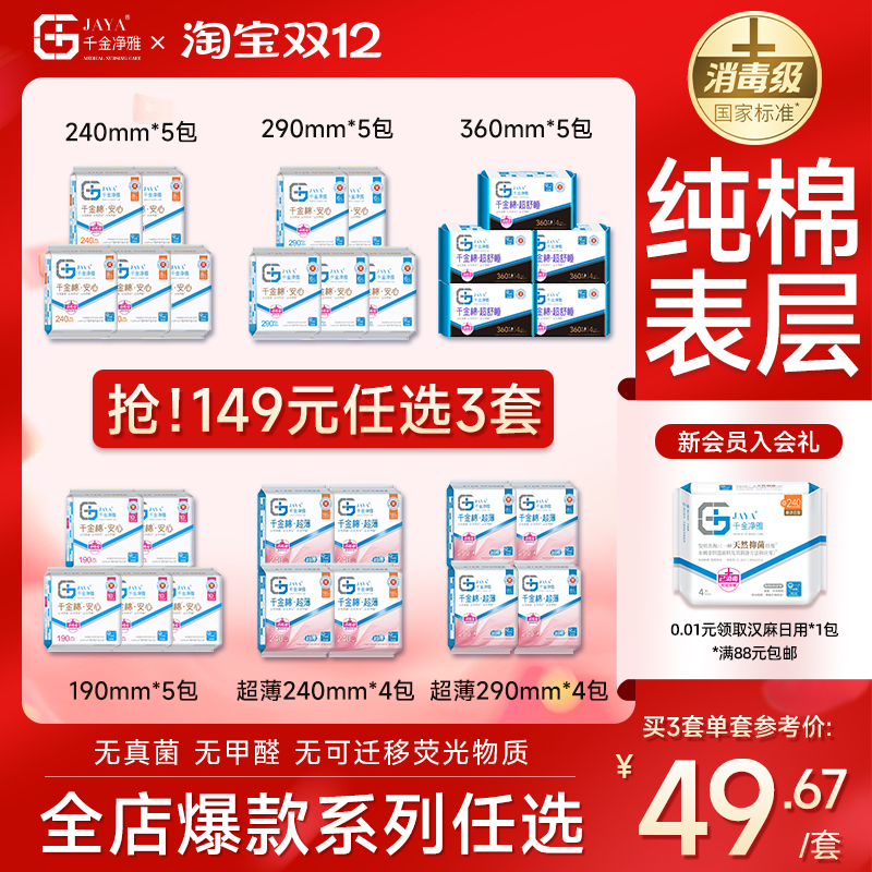 千金净雅消毒级卫生巾组合纯棉透气日用姨妈巾旗舰店240mm*5包
