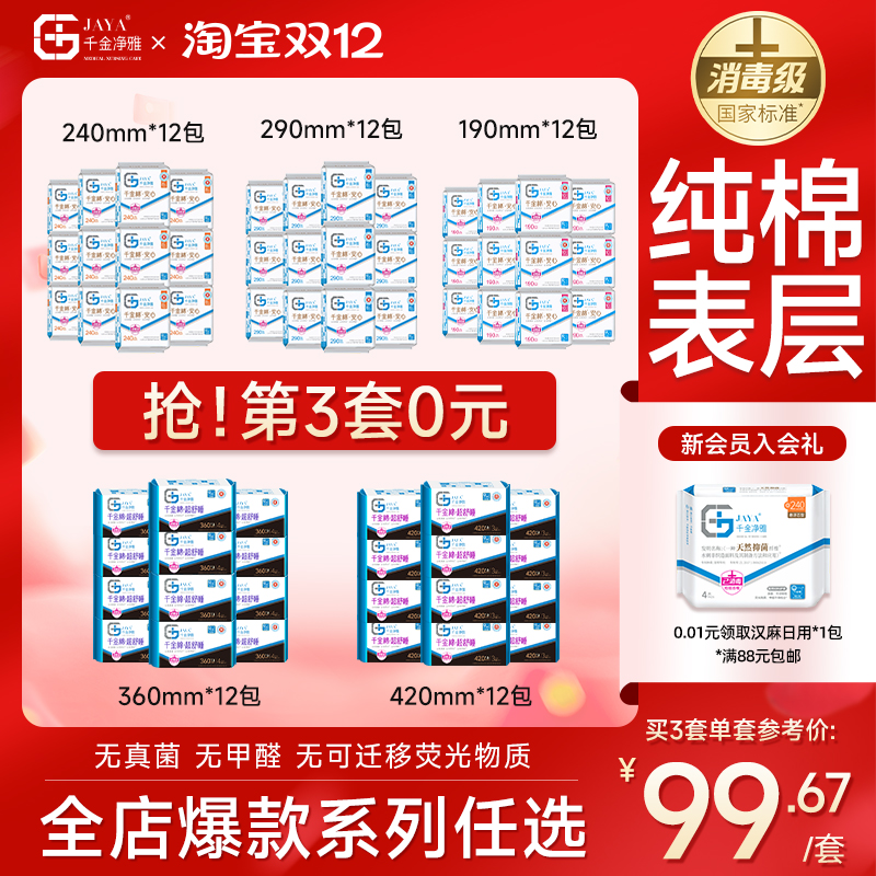 千金净雅消毒级卫生巾组合纯棉透气超长夜用姨妈巾420mm*12包