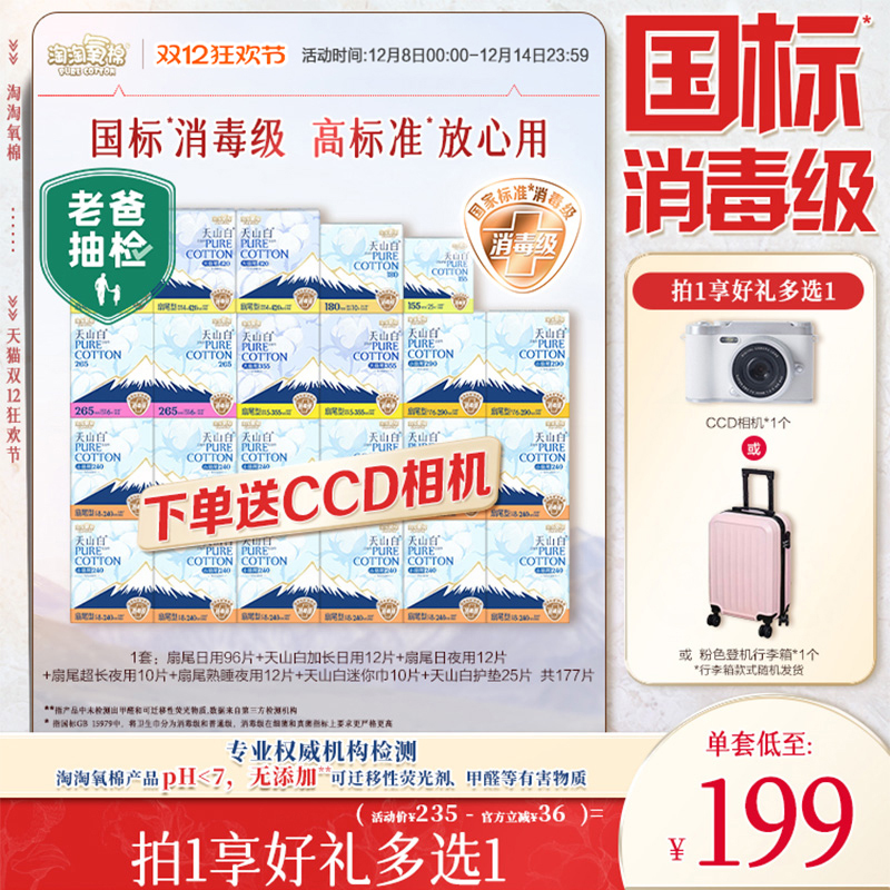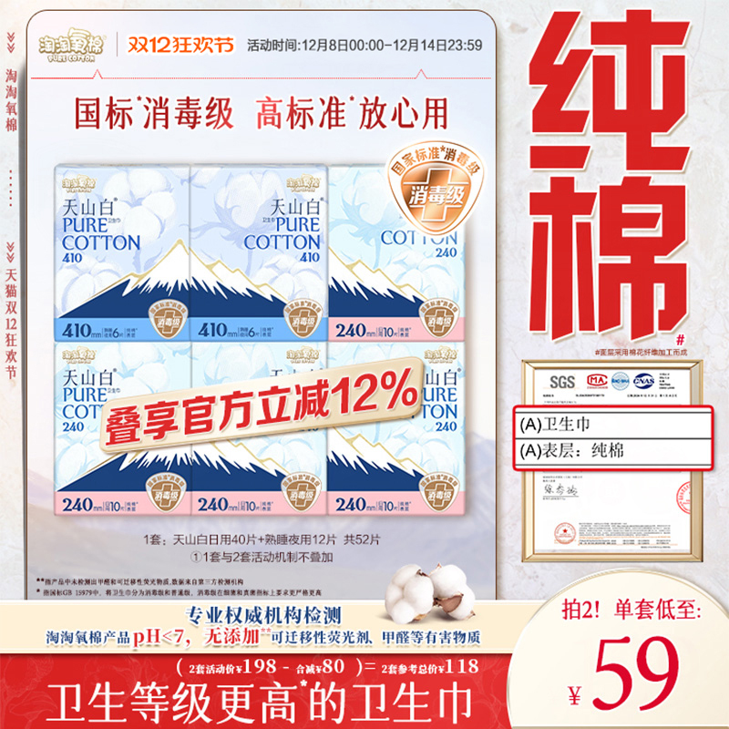 数量拍3【国标消毒级】淘淘氧棉天山白消毒级纯棉卫生巾任选组合