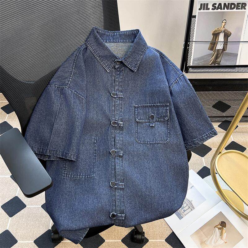 夏季复古水洗盘扣工装短袖牛仔衬衫男女宽松新中式半袖日系衬衣潮