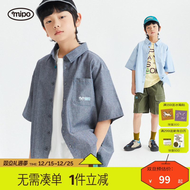 mipo儿童夏季牛仔短袖衬衫舒适牛仔面料耐穿易打理潮流男女童上衣