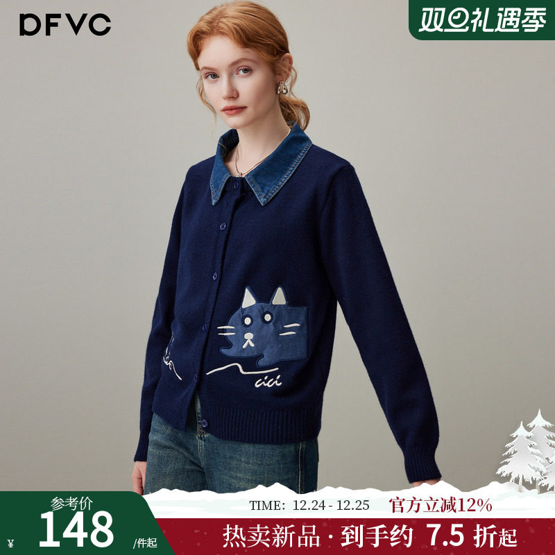 dfvc文艺牛仔拼接衬衫领针织衫女2025年冬季新款宽松短款开衫毛衣