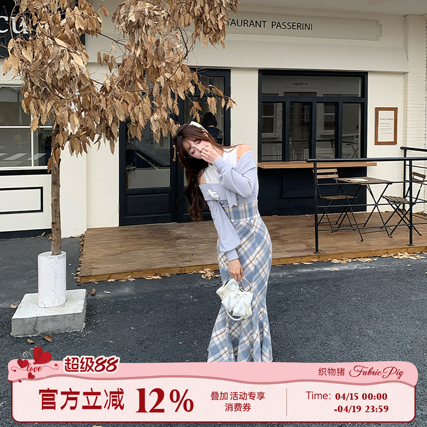 织物猪 雾蓝小熊 千金感格纹包臀半身裙女秋冬高腰毛呢鱼尾长裙子