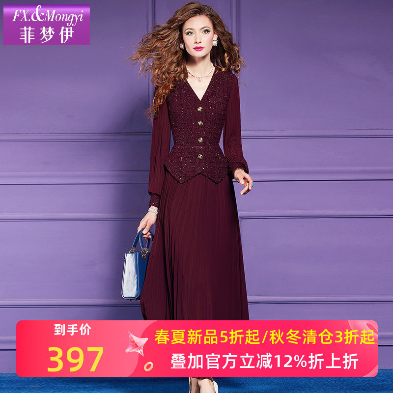 菲梦伊毛呢亮片红色连衣裙女长袖春季复古设计感收腰气质百褶裙子