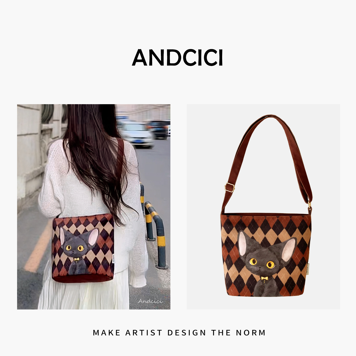 ANDCICI@美拉德文猫 斜挎拉链水桶包小方包帆布单肩包手提包女包