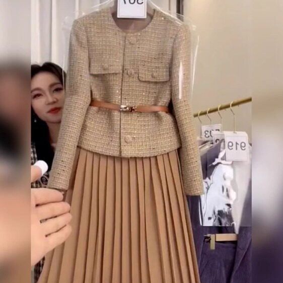 网红爆款小香风套装裙两件套春秋款洋气大摆长裙短外套风衣套装潮