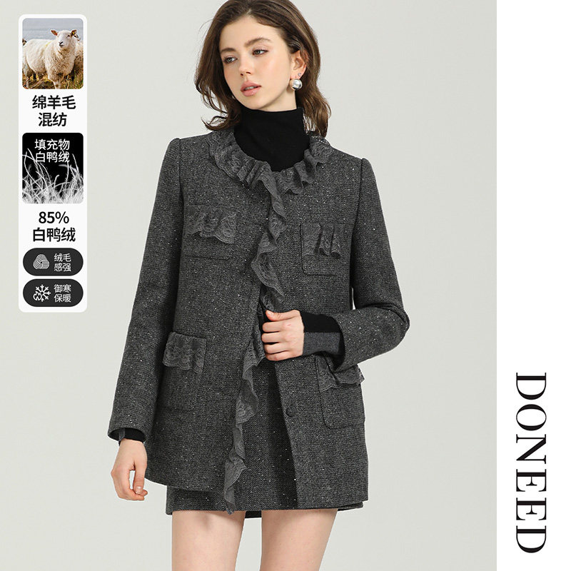 DONEED春秋款优雅气质小香风时尚套装花边羽绒外套半裙两件套女