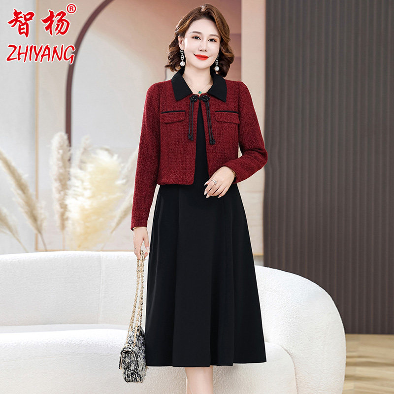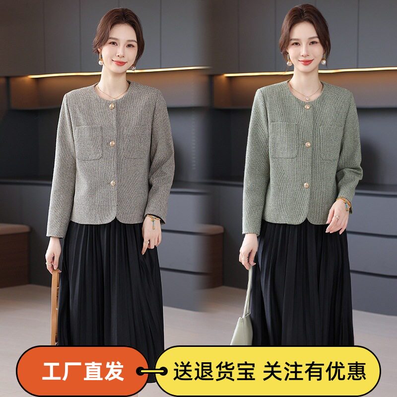 年轻妈妈秋装连衣裙套装阔太太洋气中老年小香风短款外套女春秋款