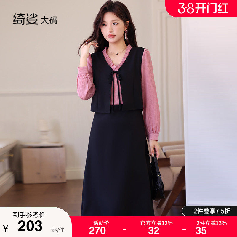 绮娑大码胖MM连衣裙秋款新款V领气质拼接假两件套装收腰A字裙长袖