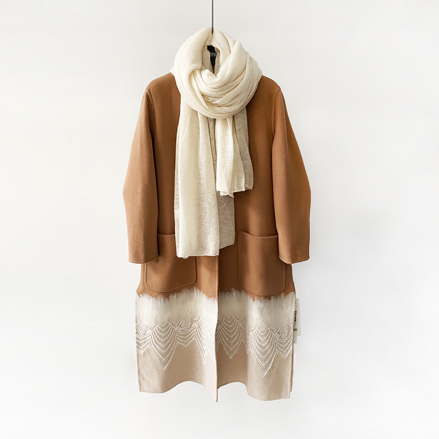特价清仓 气质感驼色羊绒大衣 针绒拼接蕾丝花纹 重工艺宽松大V领