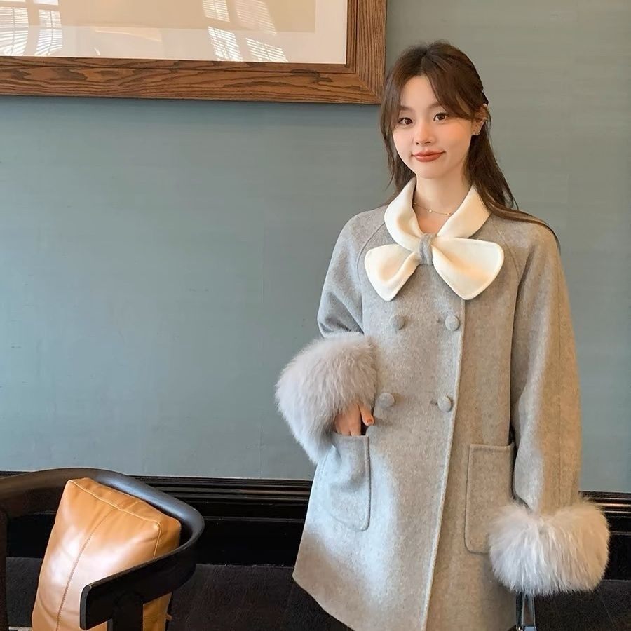 【清仓特价】千金双面羊毛呢子大衣女狐狸毛袖口秋冬撞色羊绒外套