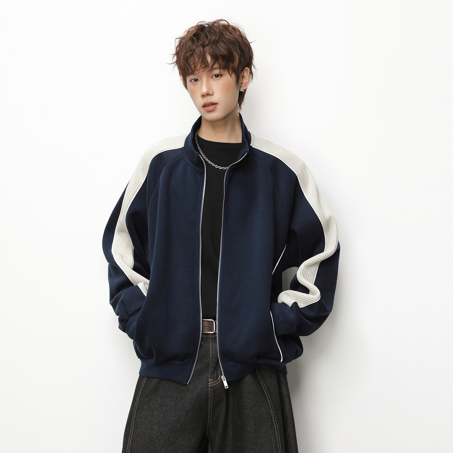 悟空有货潮牌美式撞色拼接立领运动外套男女春季宽松重磅开衫卫衣