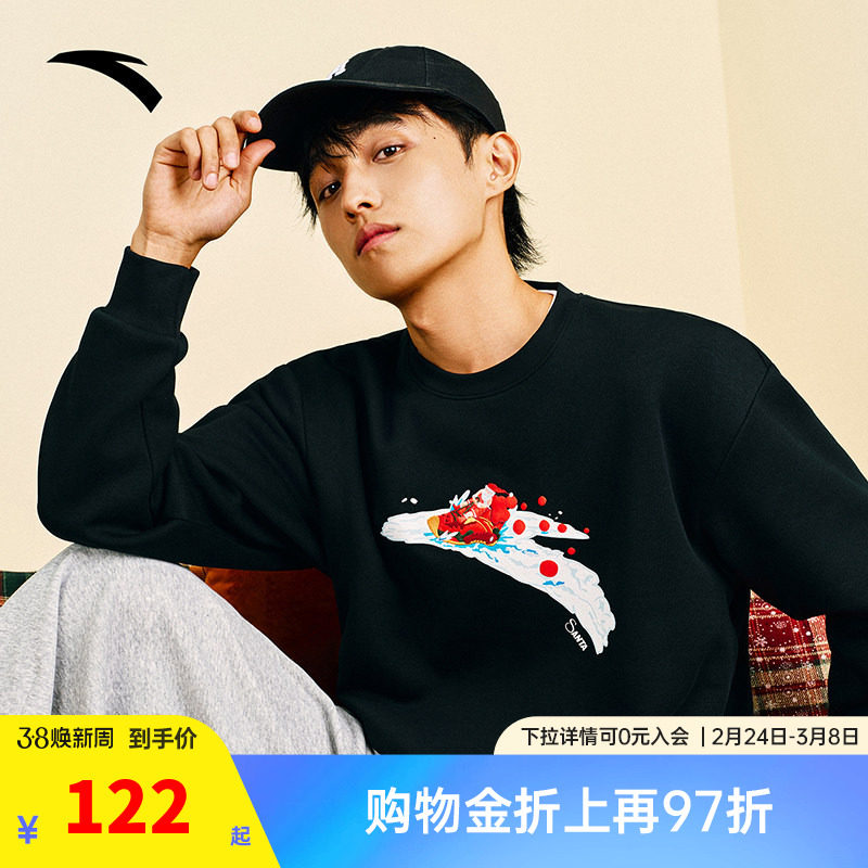 安踏加绒套头卫衣男女同款春季新款趣味圣诞印花宽松休闲运动上衣