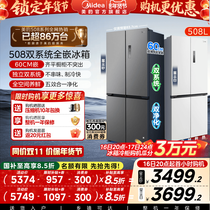 【双系统】美的508超薄零嵌入式冰箱十字双开四门家用大容量风冷