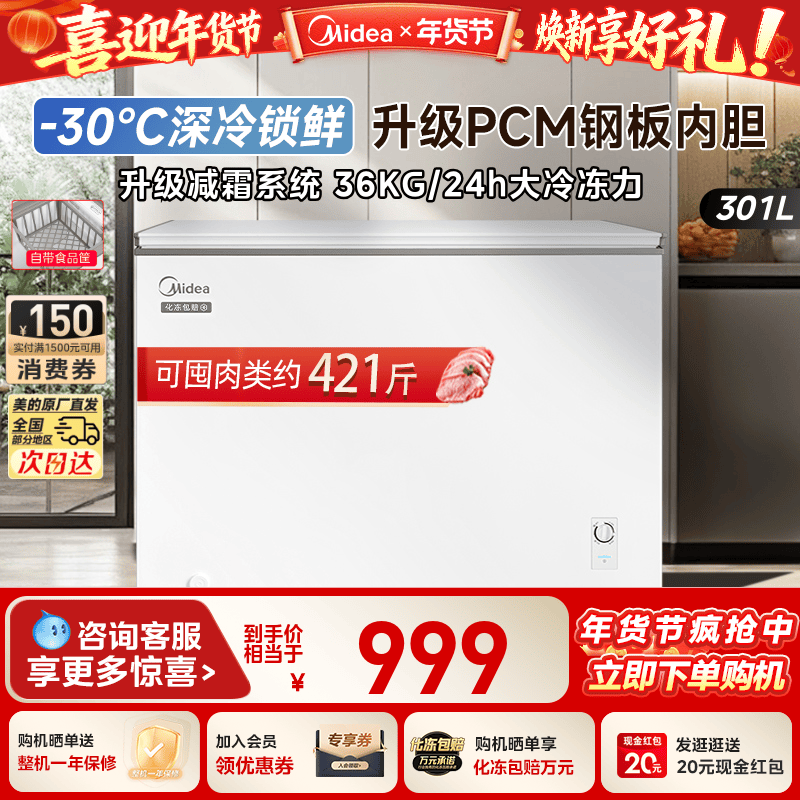 美的301L大容量冰柜家用商用两用冷柜卧式全冷冻冷藏一级官方冰箱