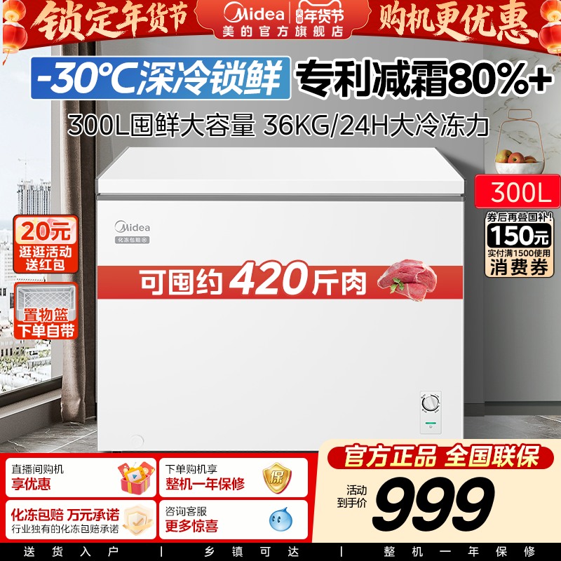 美的300L大容量冰柜家用商用冷柜冷冻冷藏两用一级冰箱官方旗舰店