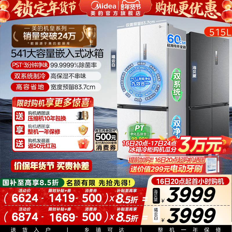 双系统|美的M60冰箱541超薄零嵌入十字双开门大容量变频520姐妹款
