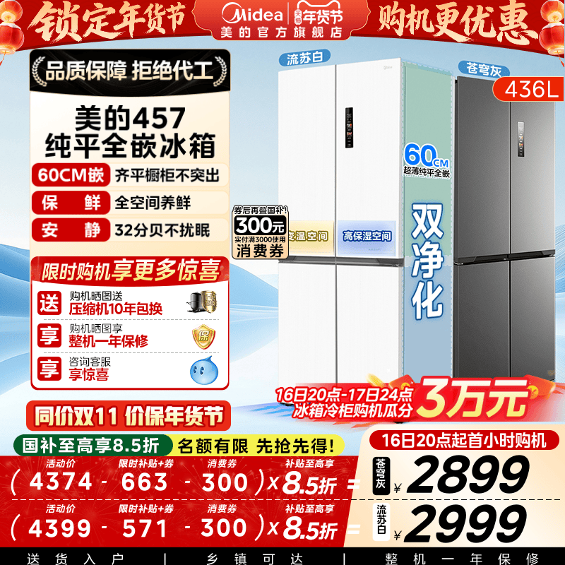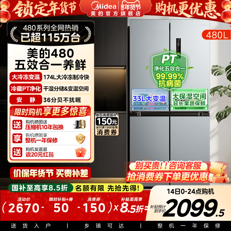 美的480L十字双开四门大容量一级风冷无霜薄嵌入家用冰箱换新补贴