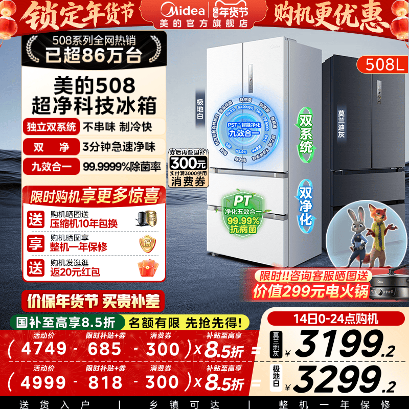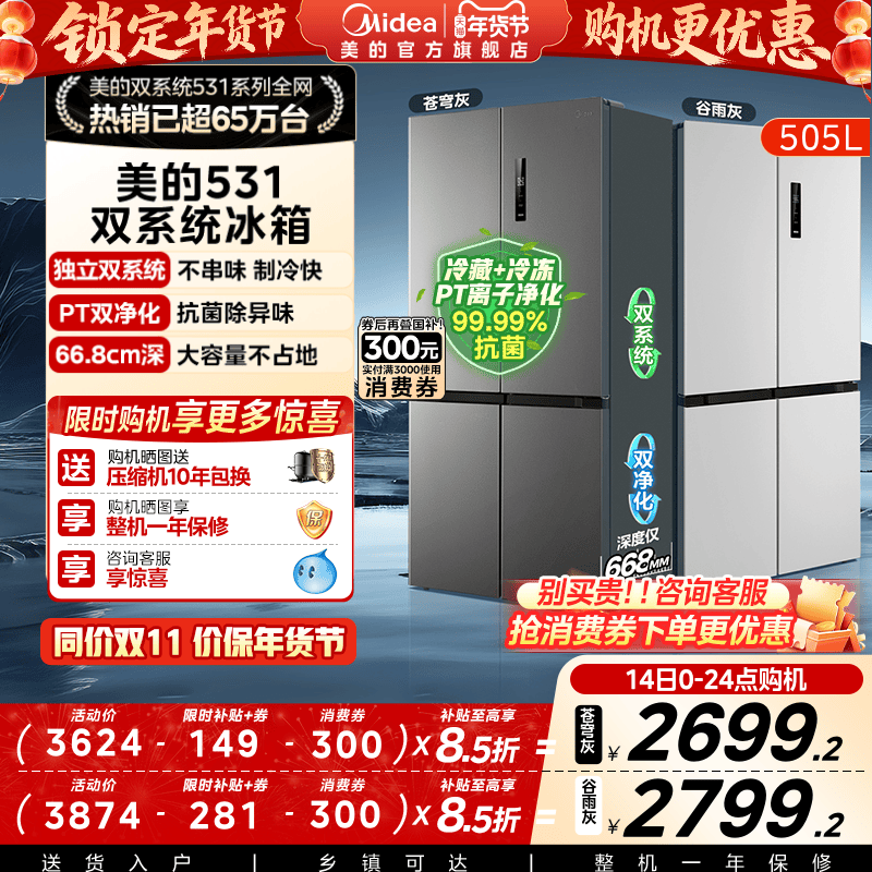 【双系统】美的508法式双循环多门四门净味无霜大容量家用冰箱