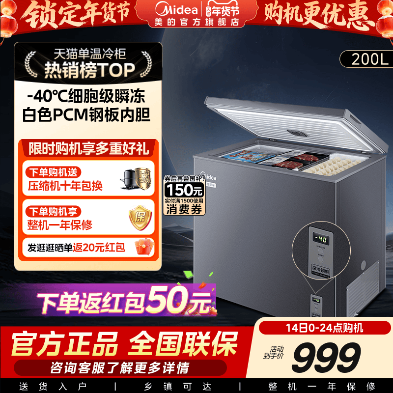 美的冰柜-40℃超低温100/142/200升冷冻冷藏家用小型冷柜一级冰箱