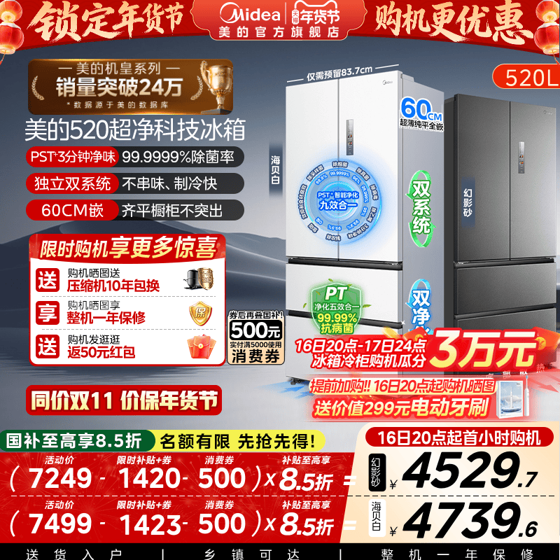 双系统|美的M60小机皇520超薄零嵌入式冰箱家用法式多门四门双开