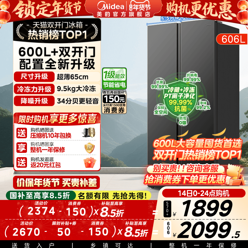 美的607L对开双开门大容量风冷无霜一级能效家用电冰箱官方旗舰店