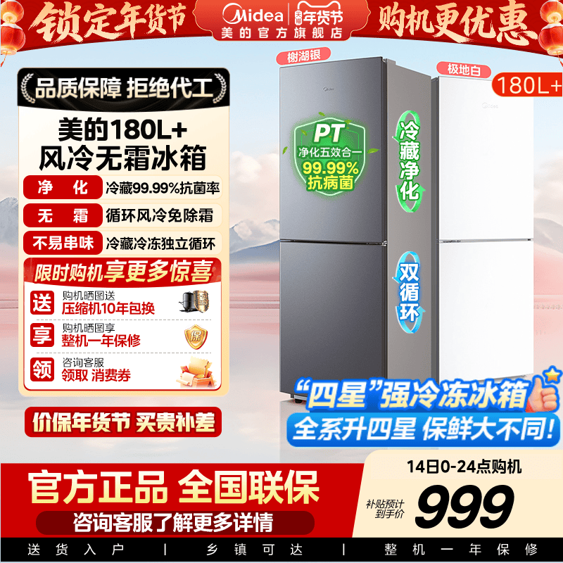 美的180+/195风冷无霜两门家用电冰箱小户型节能低噪冷藏冷冻租房