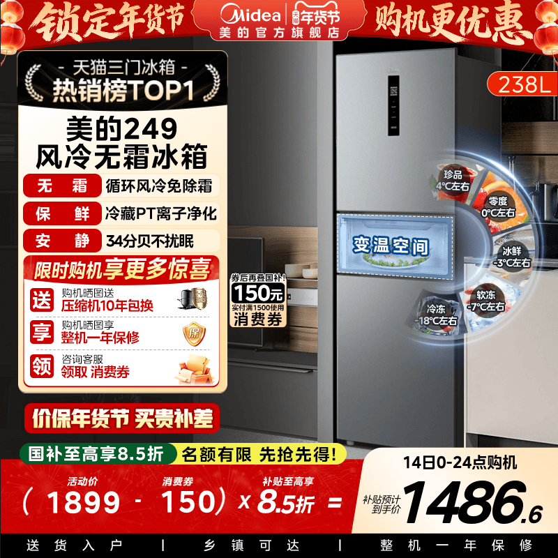 政府换新补贴美的249三门电冰箱风冷无霜变频一级能效家用小型