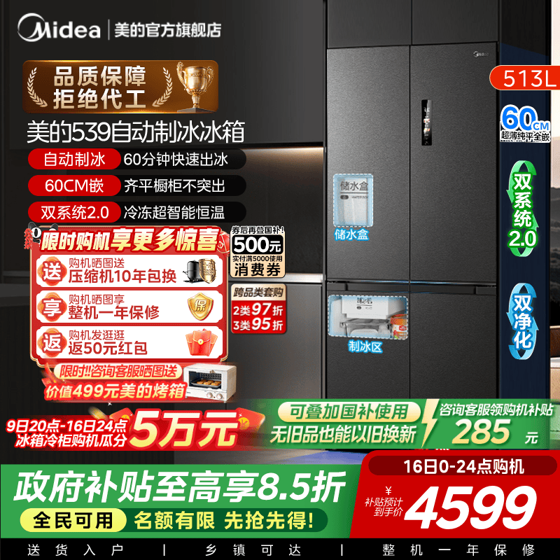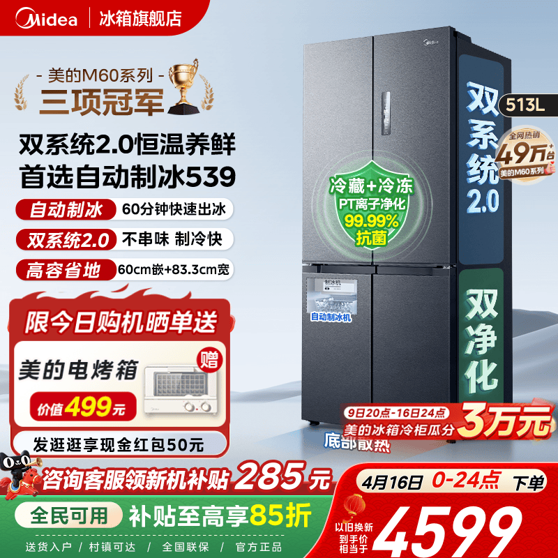 政府补贴美的M60机皇550双系统2.0零嵌入式制冰冰箱家用法式四门