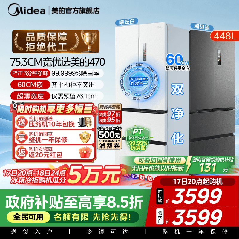 【508净味】美的双系统法式多门四门净味无霜大容量家用电冰箱