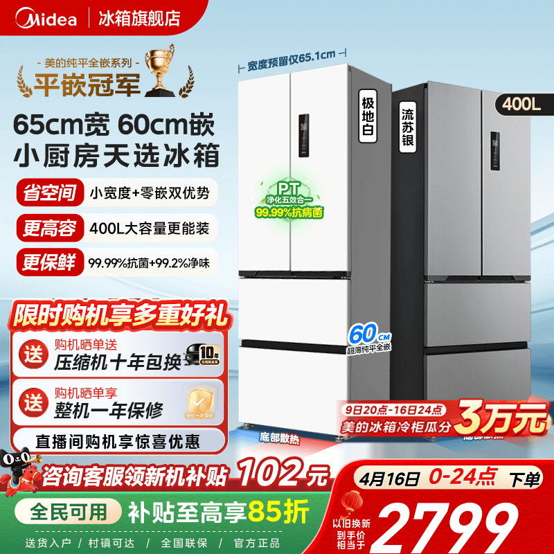 美的480L十字双开四门大容量一级风冷无霜薄嵌入家用冰箱换新补贴