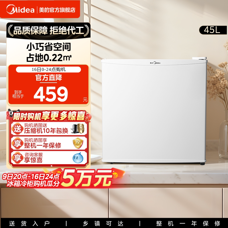 美的45升白色单门小型电冰箱冷藏家用一级节能租房宿舍客厅冰箱
