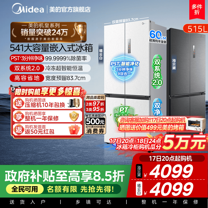 美的华凌神机小宙斯518双系统超薄零嵌自动制冰法式四门家用冰箱