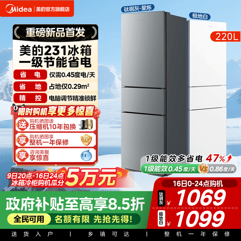 美的官方231三门小冰箱家用宿舍租房低噪冷冻冷藏冰箱一级能效