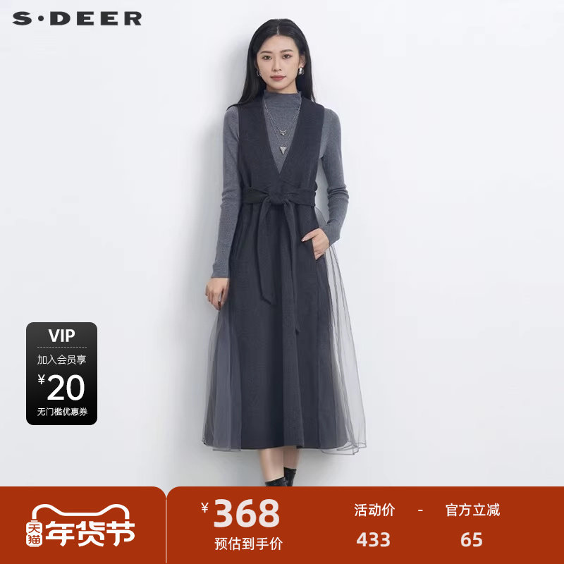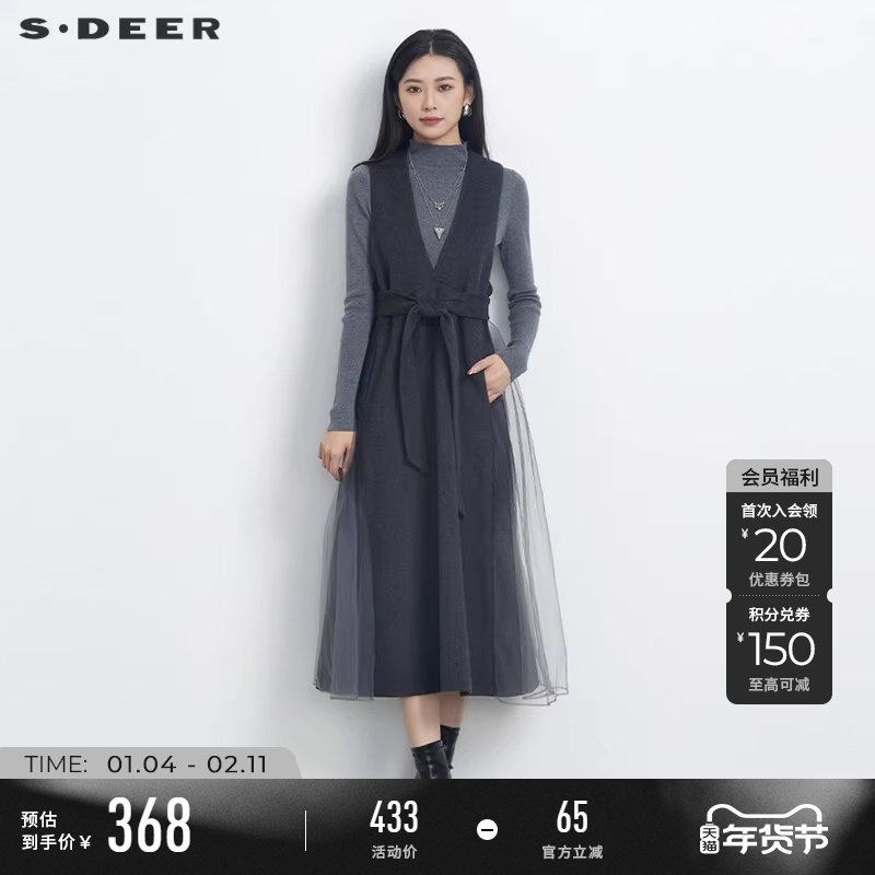 sdeer圣迪奥冬季女装V领收腰网纱毛呢背带连衣裙S23481204