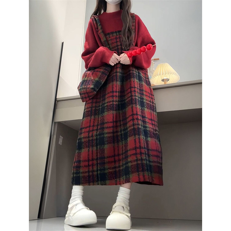 新年圣诞甜妹风复古撞色格子背带毛呢连衣裙+红色毛衣衫两件套装