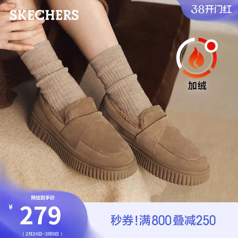 斯凯奇冬季女乐福鞋加绒保暖毛毛鞋厚底耐磨松糕鞋豆豆鞋浅口单鞋