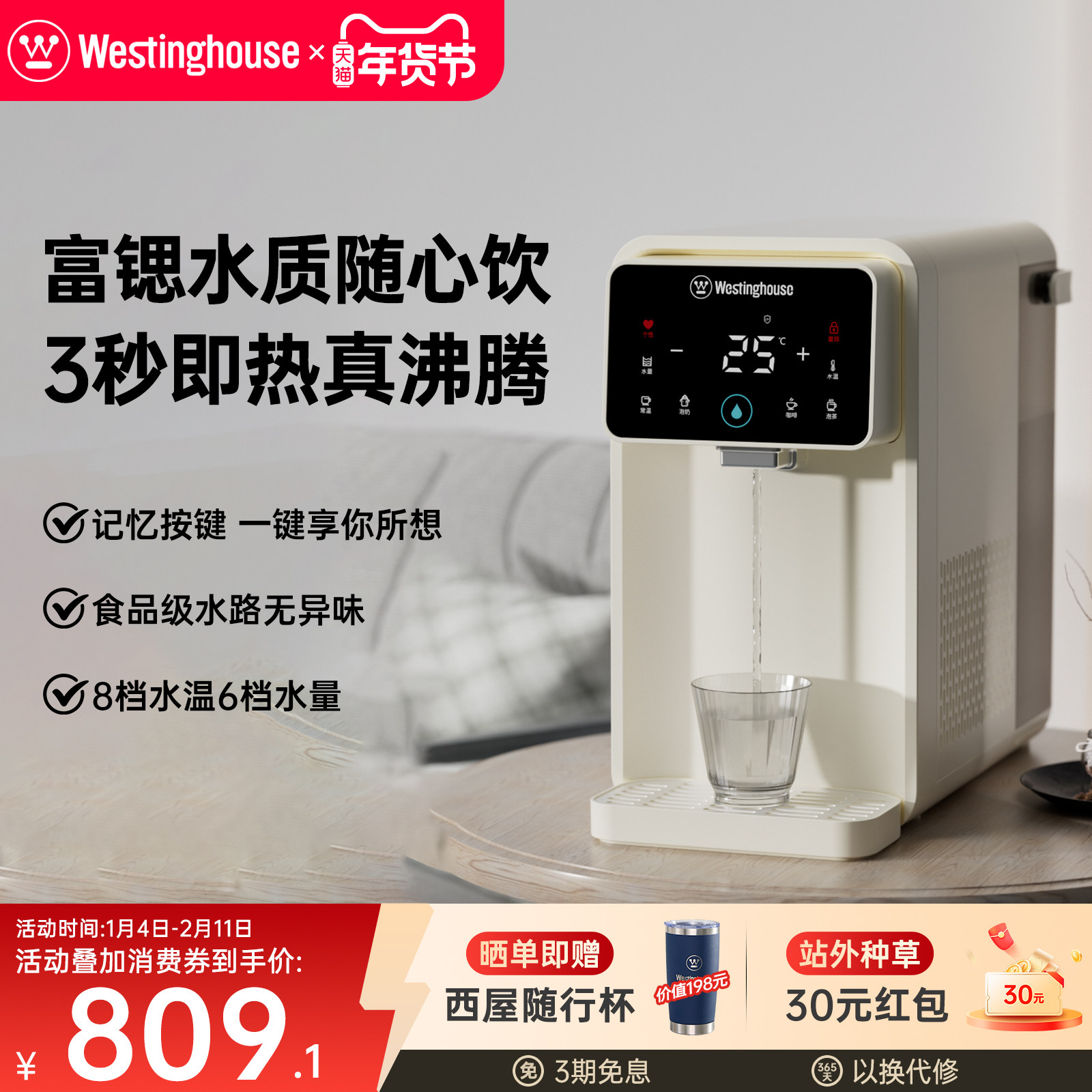 西屋即热式饮水机家用小型速热矿化富锶桌面免安装台式热水机W4C