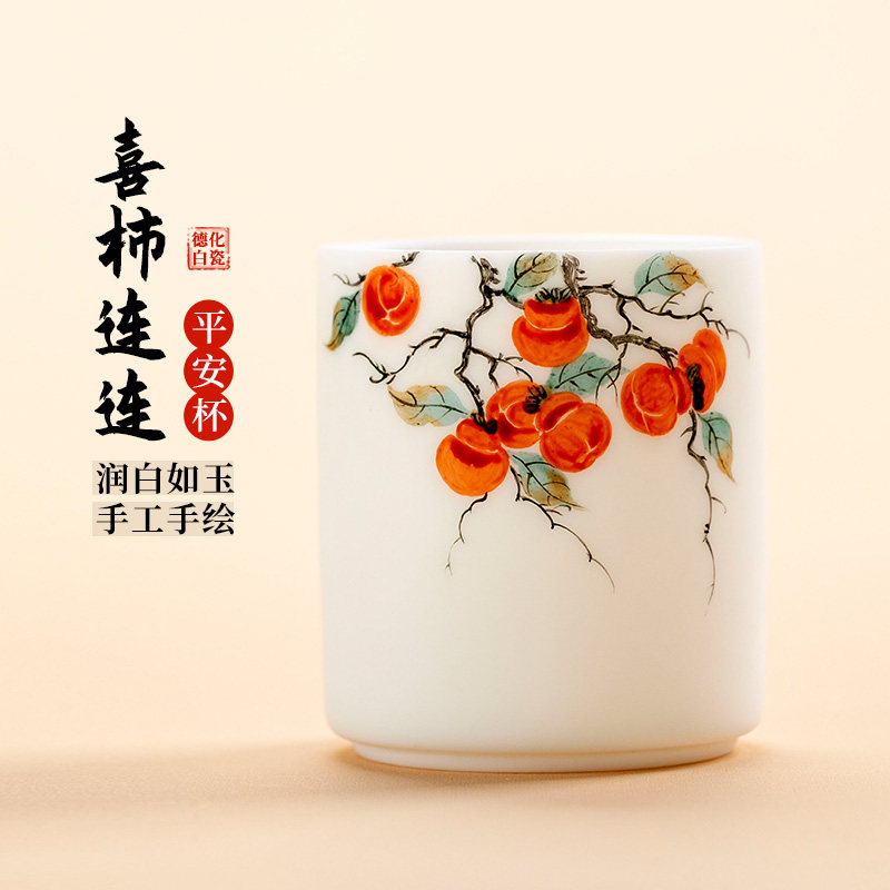 钰铨龙门 手绘喜柿连连平安杯 德化羊脂玉白瓷素烧主人杯手工茶杯