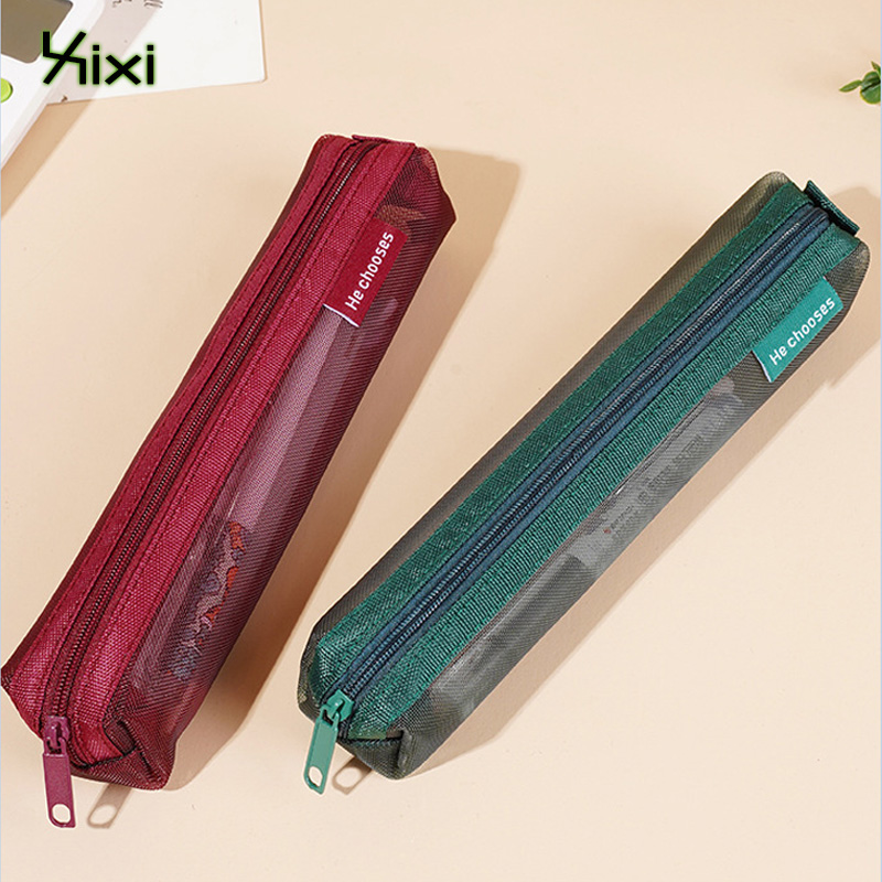包邮 网纱透明笔袋 男女学生小清新简约方型文具盒透气拉链铅笔袋