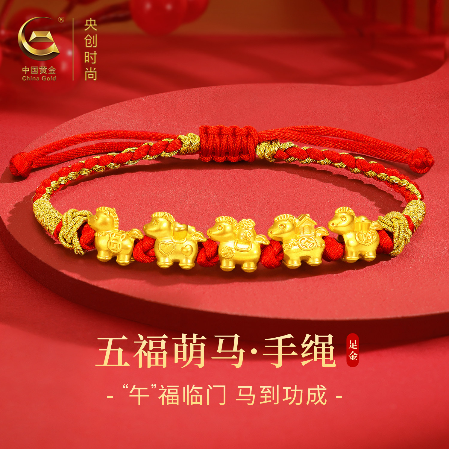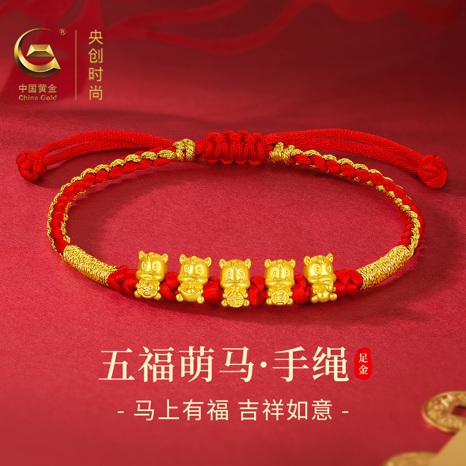 中国黄金央创马年本命年黄金手链红绳女款足金生肖新年礼物送女友